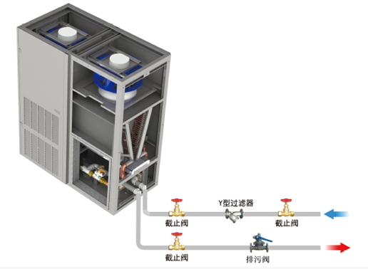 冷凍水型模塊機(jī)組自身未配備機(jī)械制冷系統(tǒng),利用外部冷水主機(jī)冷凍水進(jìn)行制冷。冷凍水流經(jīng)機(jī)組換熱盤管時,室內(nèi)循環(huán)空氣與冷凍水進(jìn)行熱交換來降低室內(nèi)溫度。冷凍水將熱量帶到外部冷水主機(jī),由冷水主機(jī)將熱量散發(fā)到周圍環(huán)境??照{(diào)機(jī)組與冷水主機(jī)通過封閉冷水管線連接。