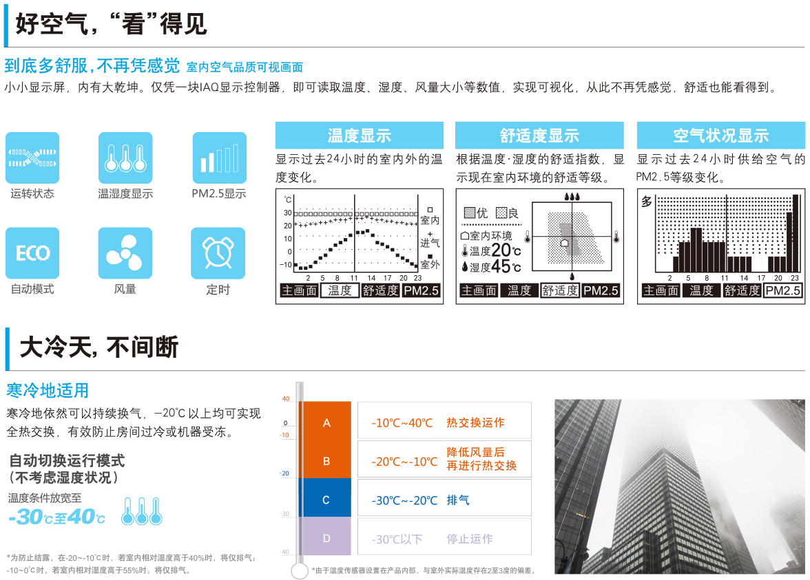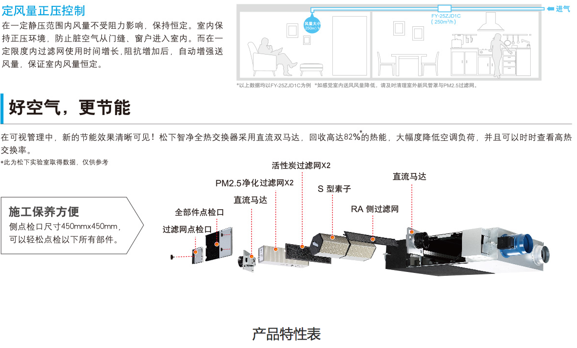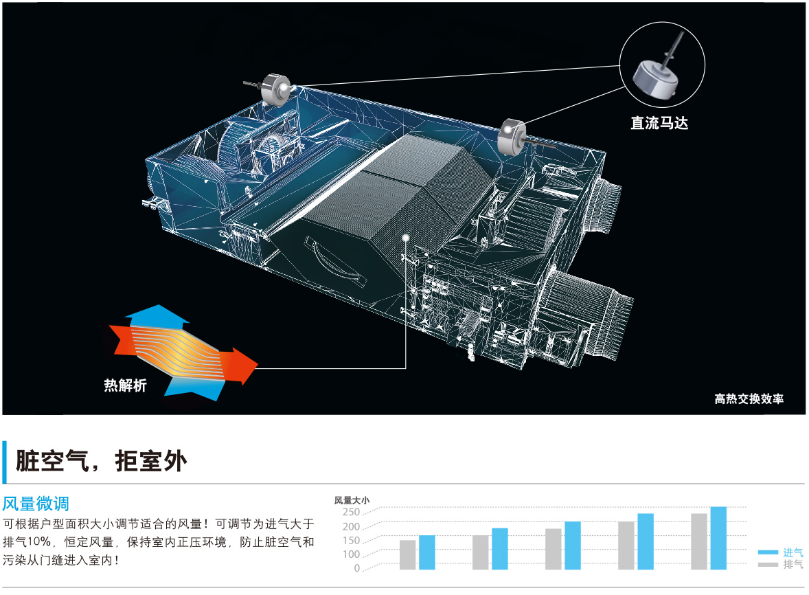 調(diào)節(jié)室內(nèi)環(huán)境,DC雙馬達(dá),實現(xiàn)定風(fēng)量正壓控制,85%的高熱能回收率,節(jié)省空調(diào)能耗。
