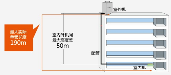 日立新風(fēng)機(jī)最大單管長(zhǎng)度增加到190米,室內(nèi)機(jī)與室外機(jī)的高度差可達(dá)50米,方便安裝。