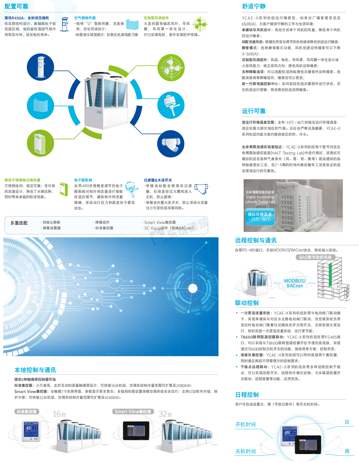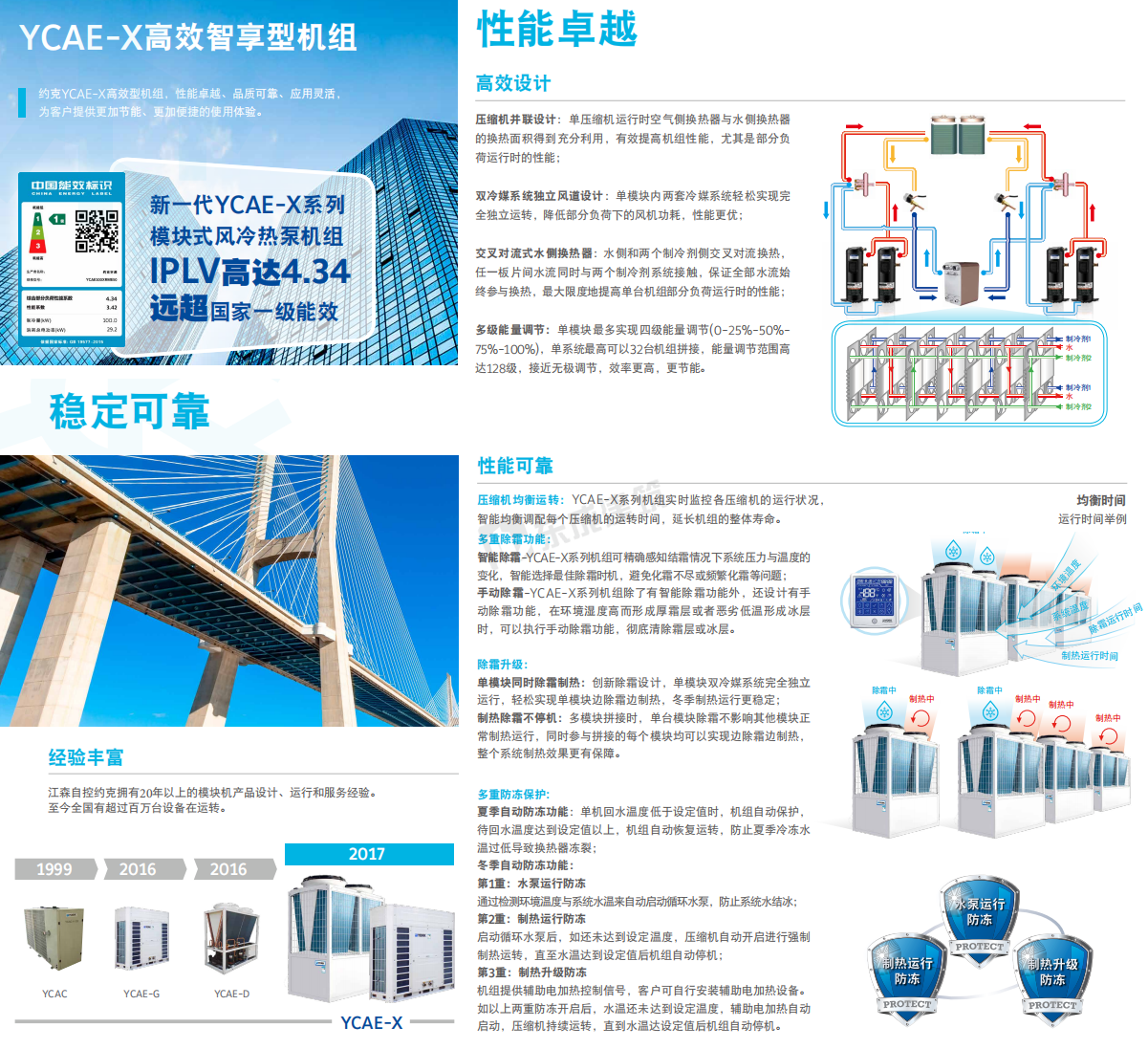 約克模塊式風(fēng)冷冷水/熱泵機(jī)組傳承YORK®多年模塊機(jī)設(shè)計(jì)、制造、運(yùn)行和服務(wù)經(jīng)驗(yàn),致力于打造約克YCAE-X高效型機(jī)組,性能卓越、穩(wěn)定可靠、智能控制、應(yīng)用靈活和低碳環(huán)保的機(jī)組, 為客戶提供更高效節(jié)能。X-Power系列以其超高效的性能引領(lǐng)模塊式風(fēng)冷冷水/熱泵機(jī)組市場(chǎng)。 |